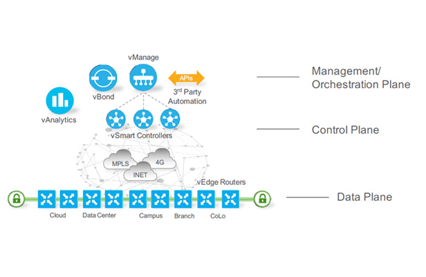 Tradicinio WAN sujungimo funkciją atliekančiame maršrutizatoriuje tiek valdymo, tiek duomenų apdorojimo dalys yra toje pačioje fizinėje dėžėje. Tuo tarpu, Cisco SD-WAN (Viptela) sprendime šios dalys yra atskirtos.